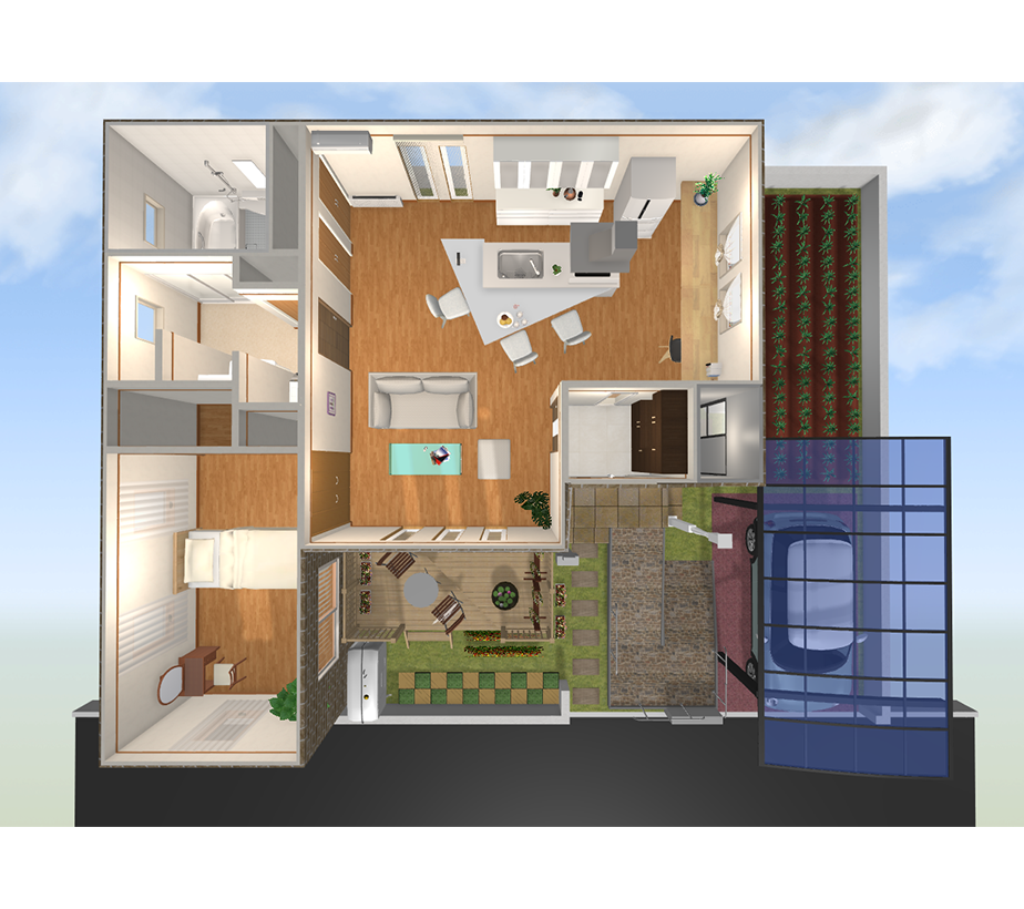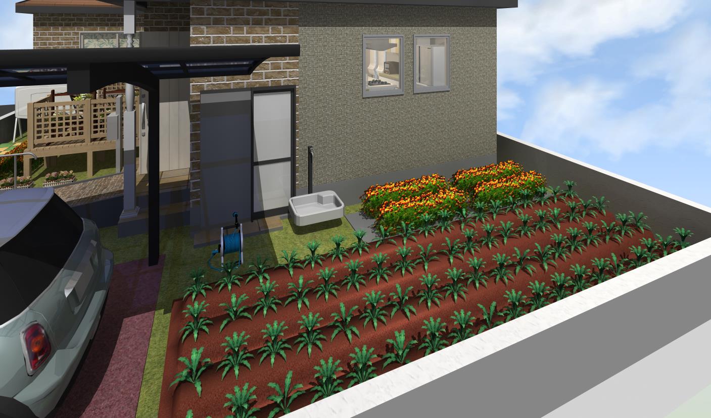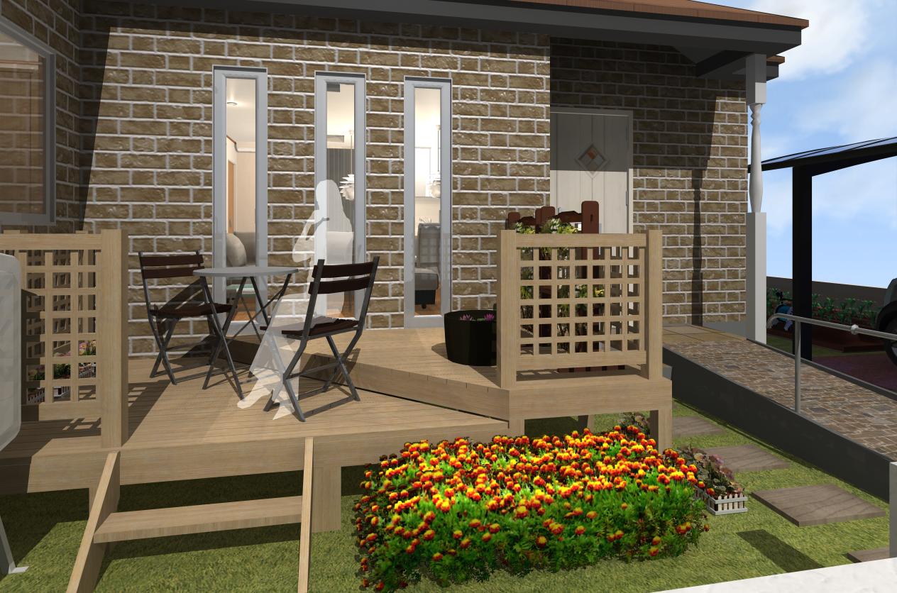 外部には、ゆったりできるテラス、ガーデニングや花や野菜を育てられる庭の広さを確保しました。