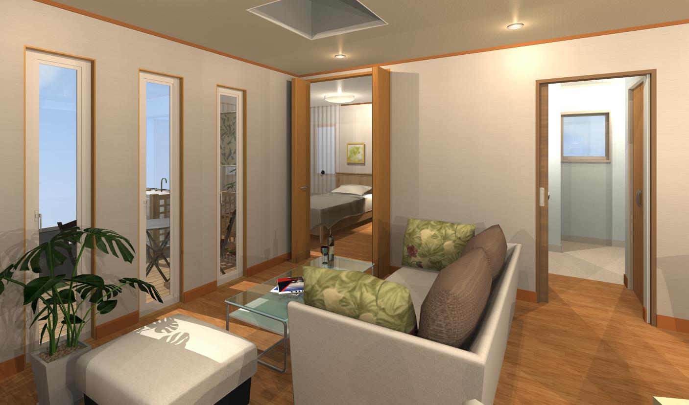 玄関を入ってからできるだけ段差を解消し、ドアは必要最小限に抑え、片引き戸又は、開き戸にしました。