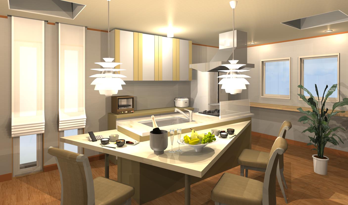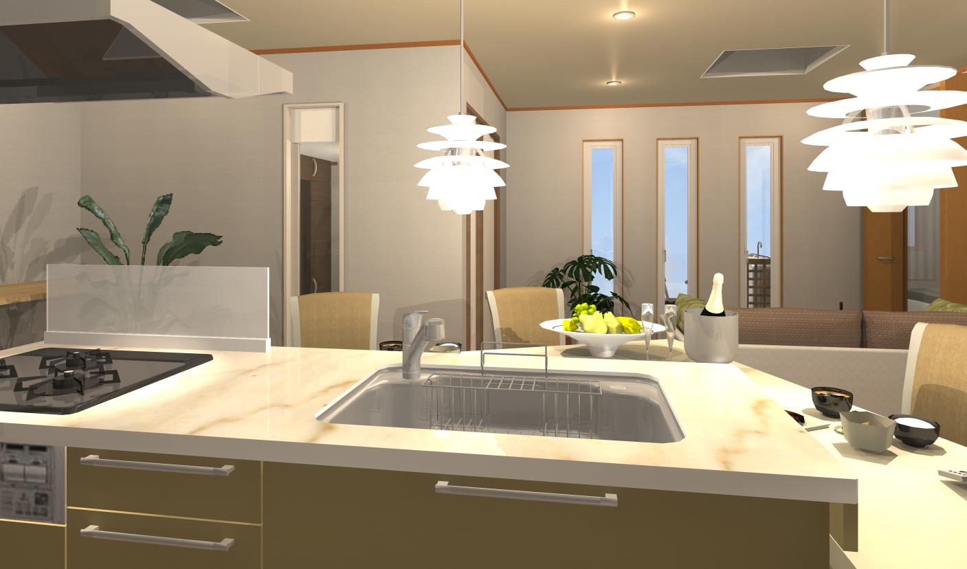 キッチンは、料理を楽しんで過ごせるように対面キッチンとし、ワークカンター及びキッチンカウンターやパントリー室を配置しました。