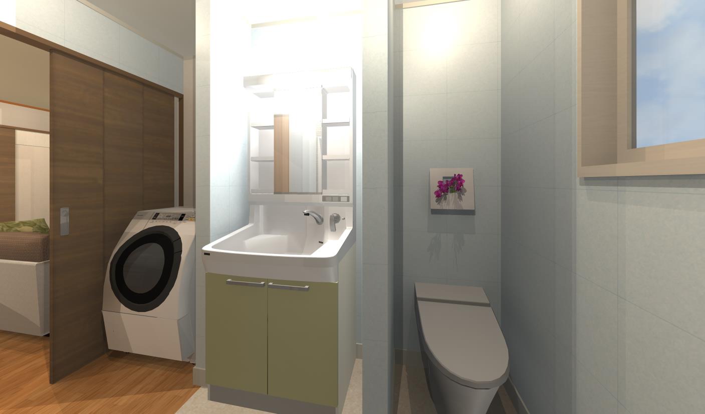 水回りにおいては、浴室は広く出入口を引き違い戸とし、トイレ、洗面、ランドリーなど一か所に集中させ壁、ドアを無くしました。