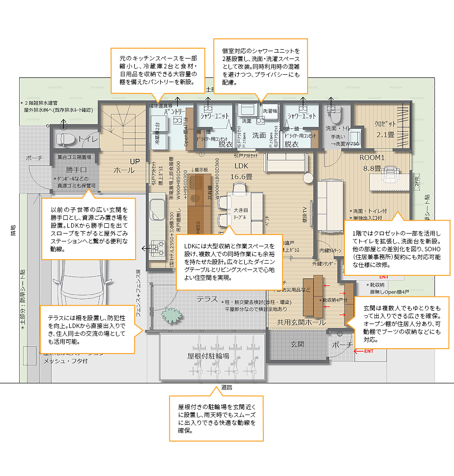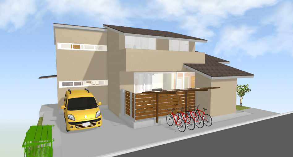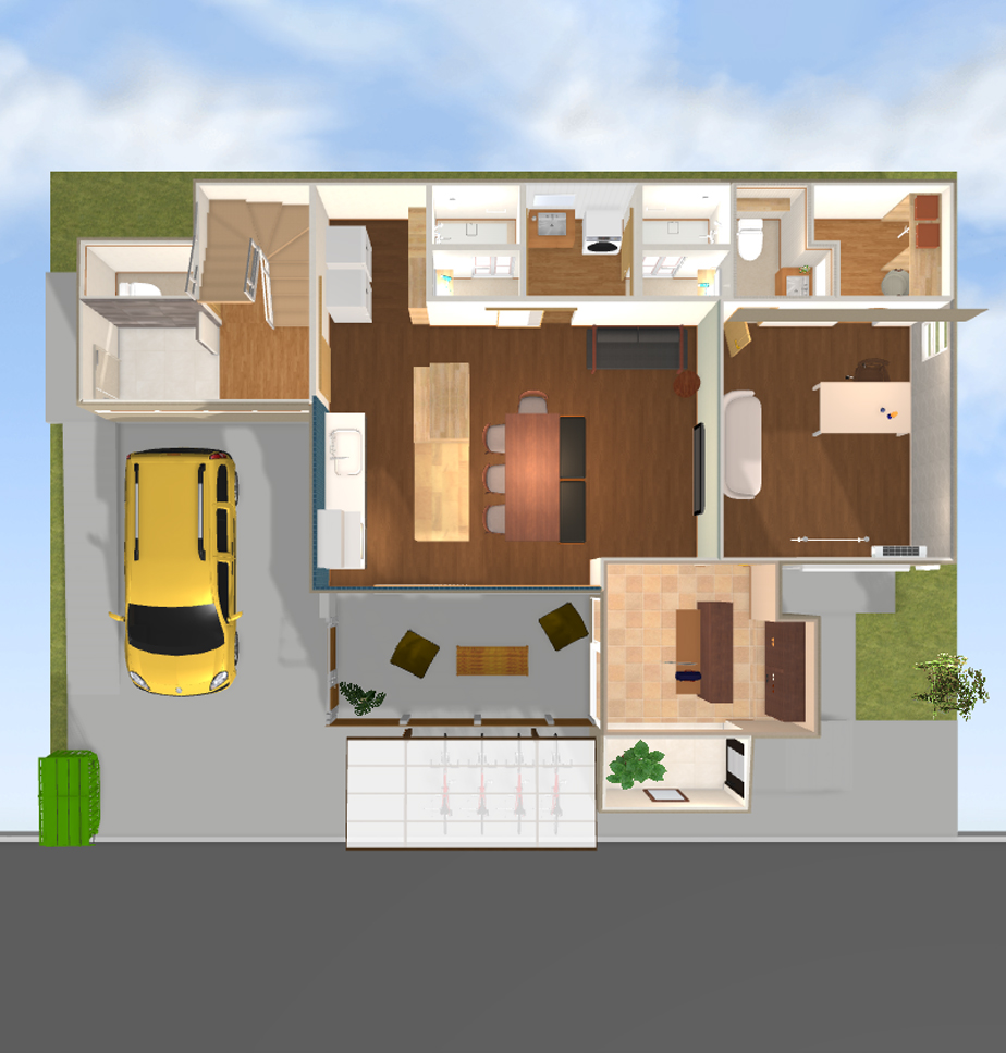 主に1階は共有スペースのLDKと水回りを用意し快適に使える設備と空間でまとめました。