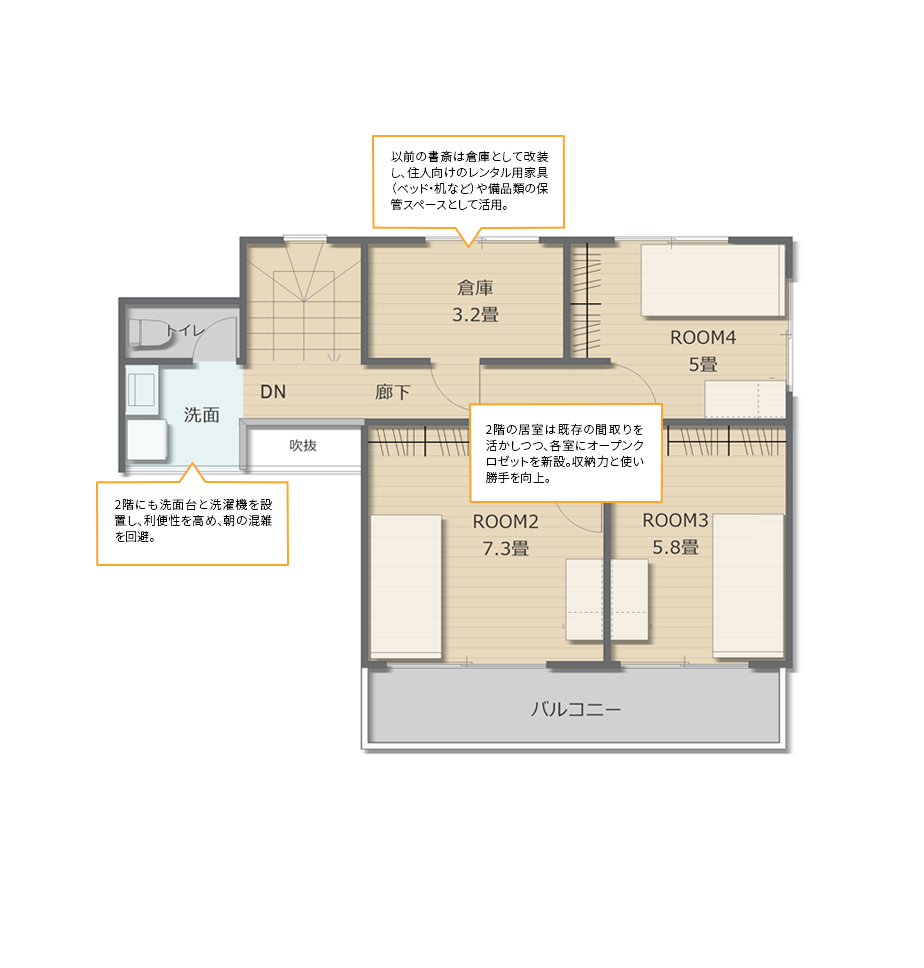 2階には3室を設け、全体で4室の居室を確保しました。さらに、2階にもトイレ・洗面台・洗濯室を設置することで、混雑の緩和と快適な生活動線を実現しています。