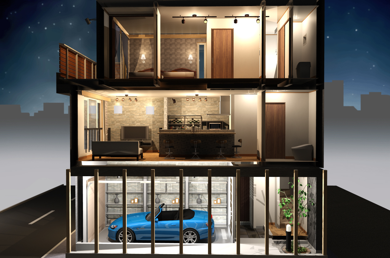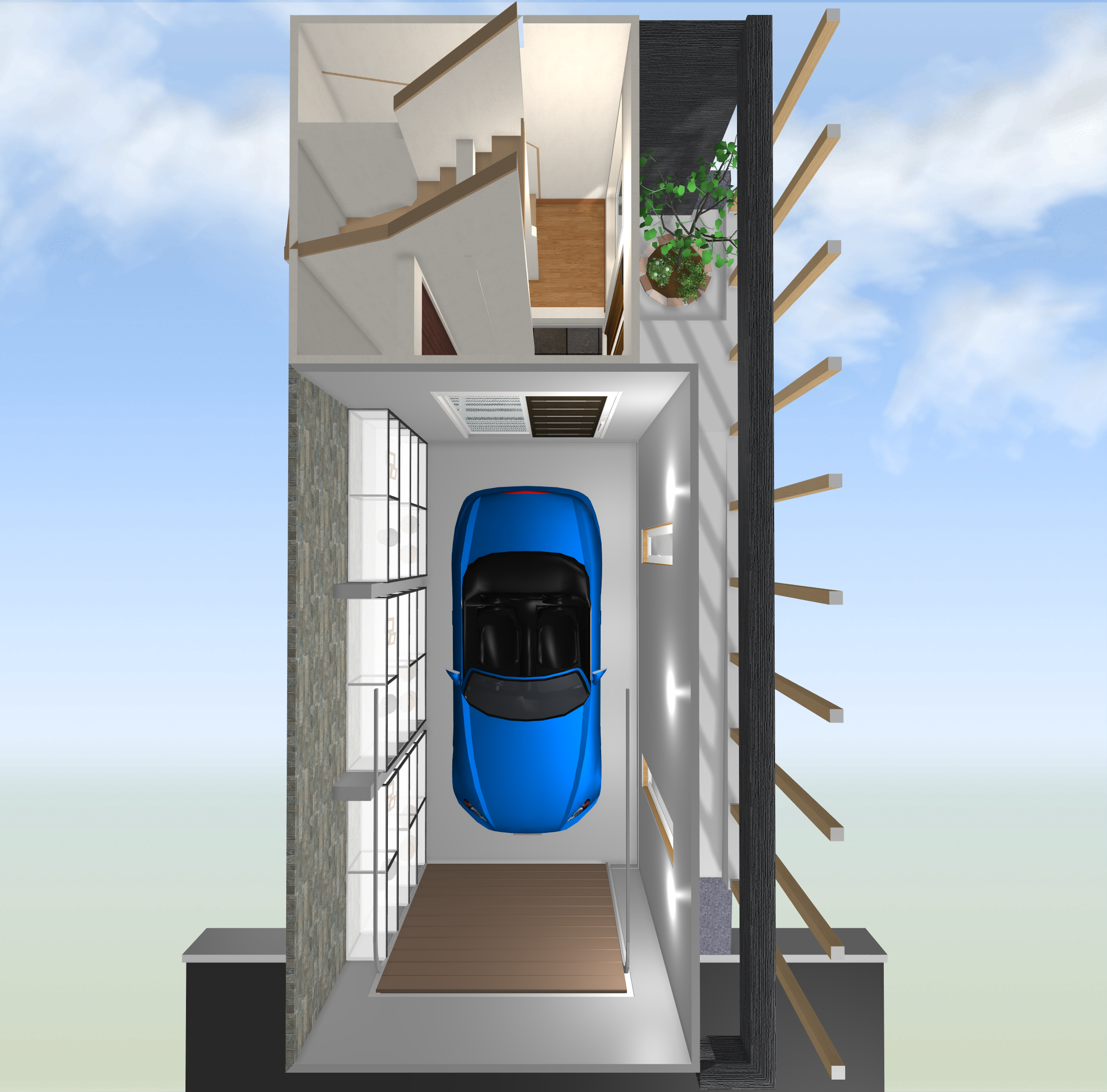 ガレージですが、金物で基礎と強固に緊結することで、小さな幅でも耐力壁とすることのできる工法を採用し、耐震性を確保しています。