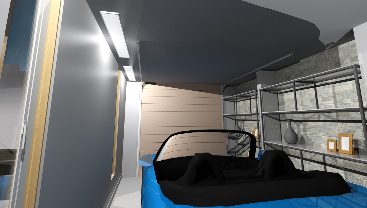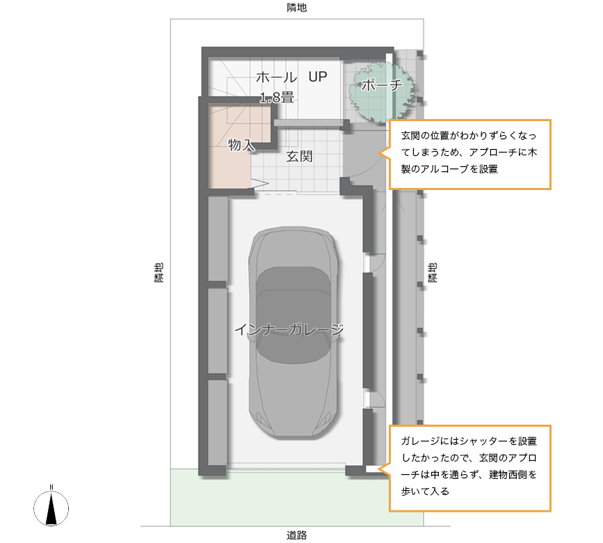ガレージにはシャッターを設置したかったので、玄関のアプローチは中を通らず、建物東側を歩いて入る計画としました。