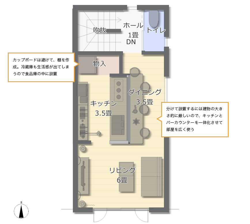 そうすると階段ホールからLDKへ入りにくくなるため、トイレを変形させて同線を確保しました。