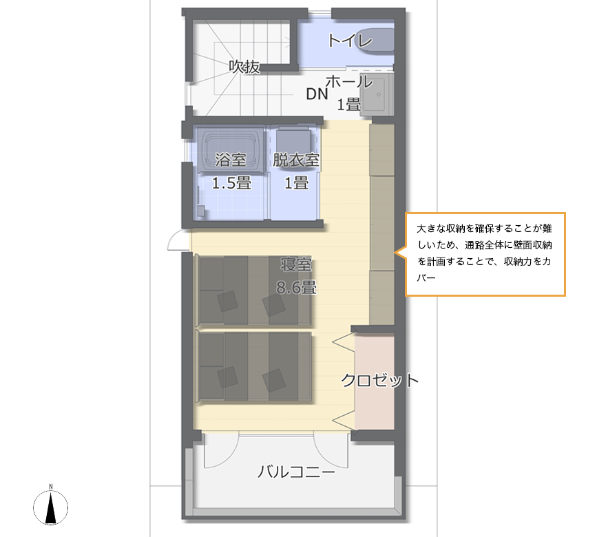 大きな収納を確保することが難しかったので、通路全体に壁面収納を計画することで、収納力をカバーしています。