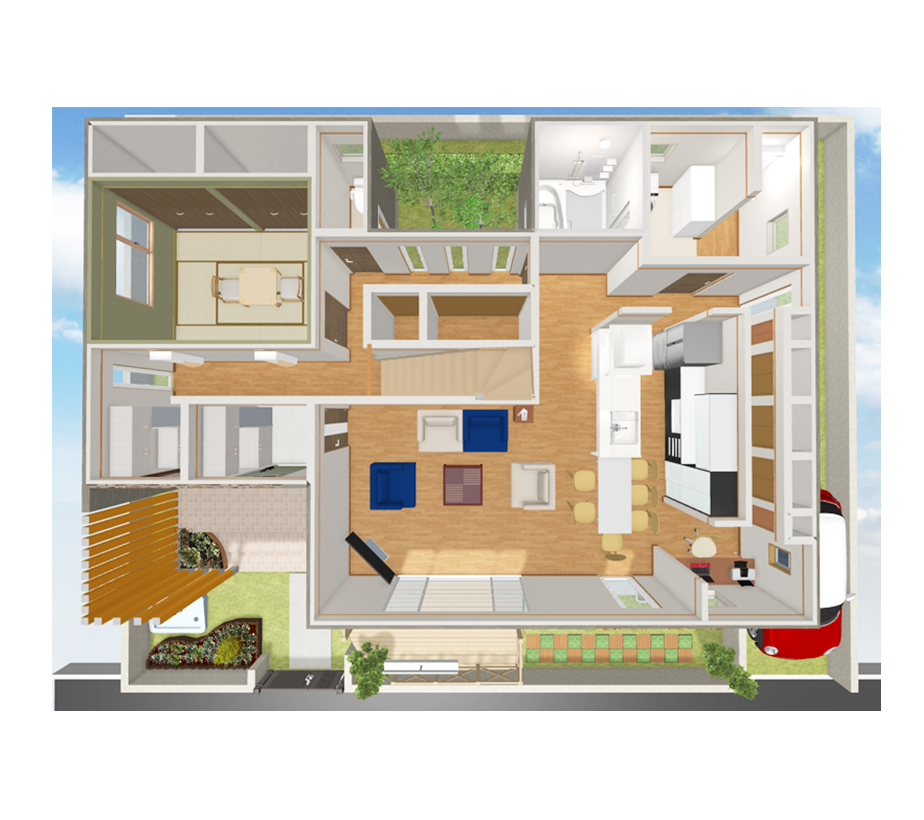 リビングでみんなでワイワイご飯を食べ、そしてガーデニングも楽しめる素敵なご家族にピッタリな二世帯住宅の間取りを考えました。