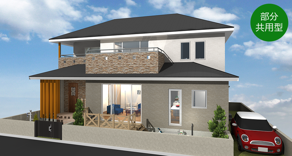 玄関や浴室などの設備の一部を共用しながらも、親世帯・子世帯が生活するゾーンを分けるのが「部分共用型」間取りの二世帯住宅です。