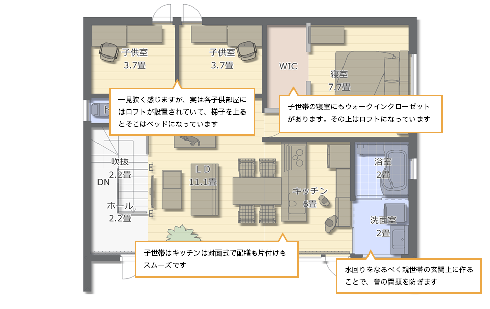プライバシーを守りながら、お互いの気配を感じる間取り