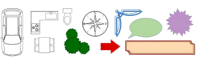 また、作成する際にタイトルや吹き出しや各種図形はもちろん、住宅系のプレゼンボード作成に役立つ家具、キッチン、樹木などの高品質な図形を多数収録。