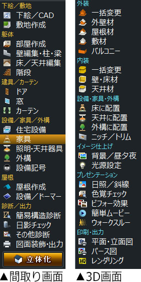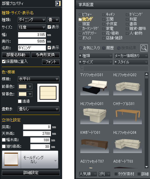 部屋や家具などのオブジェクトを選択すると、操作画面右側の「プロパティパレット」に即座に情報を表示します。