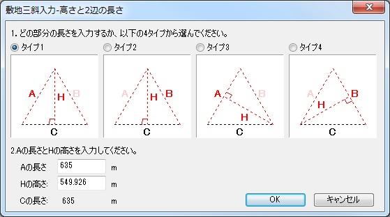三斜測量図入力に対応。三角形の三辺の長さを与えて作図する方法と、二辺と垂線の長さを与えて作図する方法の2つを組み合わせて敷地を作図できます。三斜求積表の自動作成、配置も可能です。三辺長さの場合はヘロンの公式、二辺と垂線長さの場合は底辺×高さ÷2で面積を計算した計算根拠表を出力します。