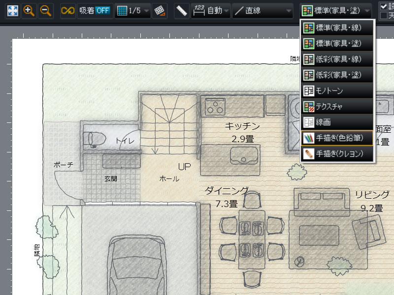 既存のカラー・モノクロ・線画・テクスチャだけでなく、手書き風の平面図もボタン1つで切り替え。