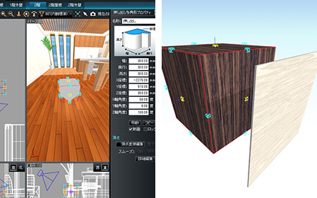 家具や小物まで幅広くデザイン 3Dアーキデザイナー11 Professional 3DインテリアデザイナーNeo10 3DマイホームデザイナーPRO10 3DマイホームデザイナーPRO10EX 3D住宅リフォームデザイナー10 オリジナルの造作家具や小物を、3D画面で直接描いて作成。 オリジナルのパーツを作る 3D画面で直接パーツを作りこむことができる、形状作成機能を標準搭載。 直方体や円錐、回転体、押出し多角形といった形状を組み合わせてプランに合ったオリジナルの家具や建具、小物を作成できます。 パーツを分解・グループ化する 収録されているパーツは分解することがができます。 パーツから不要な部分を削除したり、サイズを調整することも可能です。 また、複数のパーツをグループ化させてパーツとして扱えます。 作成・編集したパーツはお気に入り登録することで、いつでもパレットから呼び出してつかえます。