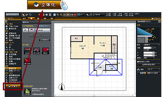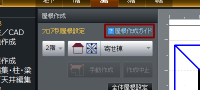 一面ずつ屋根面を作成する方法や「大屋根」「棟違い」などよくある屋根の作り方は、「屋根作成ガイド」を参考にしてください