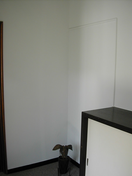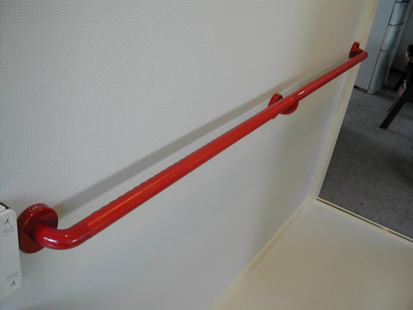 色彩は施主の要望で明るく清潔な感じにまとめました。白を基調に、壁紙は淡いグレーとし、アクセントとして手すりにビビットな赤を使いました。