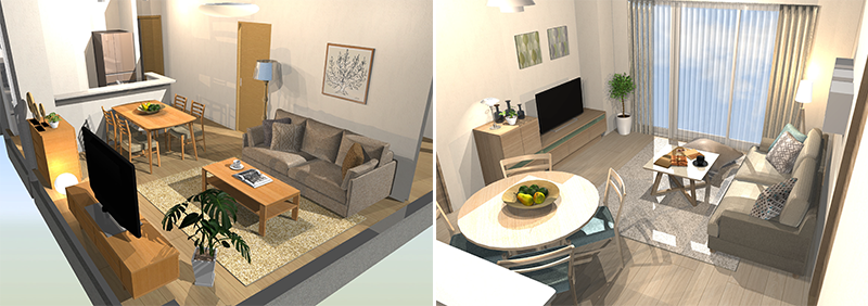 新築マンションの入居者向けインテリアフェアを開催するのですが、残念なことに実際の家具を持ち込めないことが多いのです。どうしたものかと思っていたのですが、前回、3Dマイホームデザイナーで作成したいくつかのパースを持って行ってみたら、一目瞭然、弊社がいろいろなテイストの家具を扱っていることを伝えることができました。
