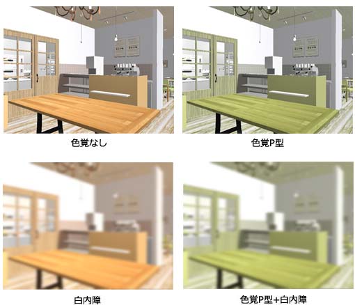 3DマイホームデザイナーPRO7以上の製品では[色覚・白内障シミュレーション]を使い、白内障や色覚特性を持つ方がどのように見えるかをシミュレーションできます。店舗作りの検討にお役立てください。