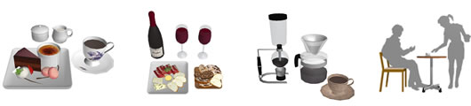 空間の雰囲気を高める料理や飲料、デザート、調理器具、シルエット人物などのアイテムも多数収録。