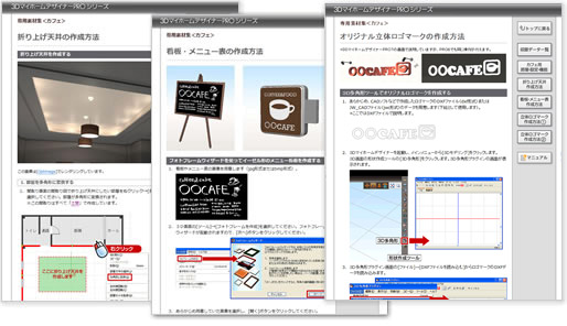 3Dデザイナーシリーズを使ってカフェの店舗デザイン、3Dパース作成を行うためのノウハウを解説した「テクニック集」を付属しています。