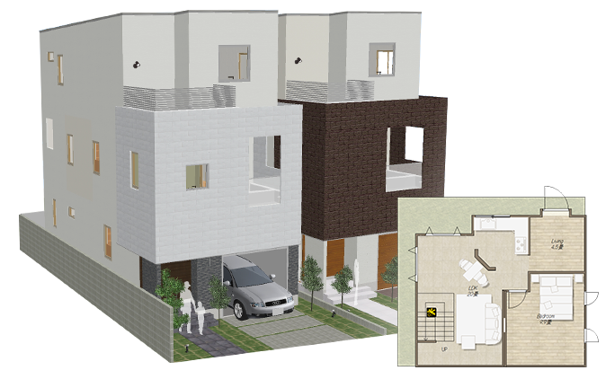作成した間取り図は1クリックで3Dパース化。立面・鳥瞰図をはじめプレゼンボードやウォークスルー動画もスピーディに作成できます。
