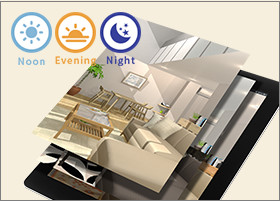 外観・内観デザインだけでなく、あらゆる角度でのプレゼンが可能です。3Dウォークスルー動画では実際に生活しているイメージを、昼夜切り替えモードでは日照の入り方や夜のイメージを共有し、施主の満足度を高めます。