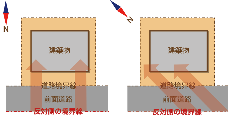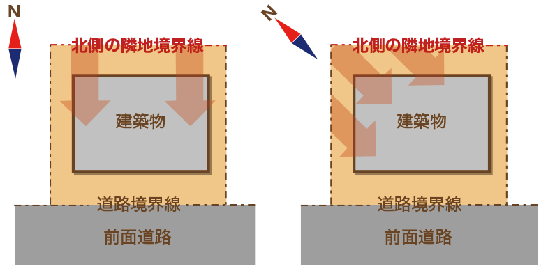 「北側斜線」の勾配は「隣地斜線」のように、境界線に対して直角に斜線を引くのではなく、真北に対して引くよ。
