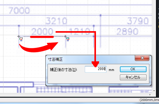 マウスで始点と終点をクリックすると、「寸法補正」画面が表示されるので、図面に書かれたその長さの数値を入力すると自動的に縮尺されます。