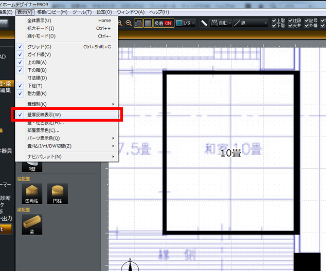 画面上部の「表示」メニューから「壁厚反映表示」のチェックを外します。