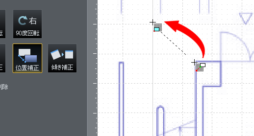 傾き補正では、水平になる辺をマウスで線を描いて支持します。その線に従って下絵が傾きます。