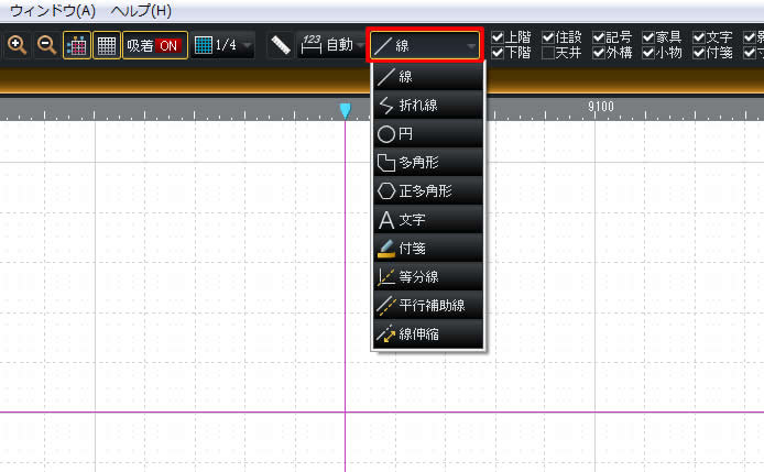 画面上部にあるボタンをクリックして、表示された種類から、描きたい種類の項目をクリック。
