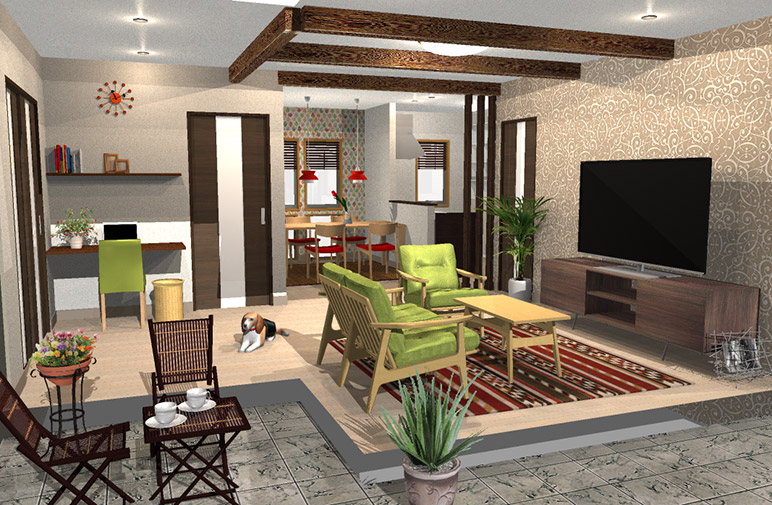 梁のある家 作品名 梁のある家 作成者 株式会社 ナカザトホーム 落合 文子 さん 使用ソフト 3DマイホームデザイナーPRO8 加工ソフト Optimage コメント お客様のご提案イメージパースとして作成。 手前の壁を非表示にし、部屋に家具や小物を配置して部屋の奥行きや空間の広さがお客様にわかりやすいように作成しました。