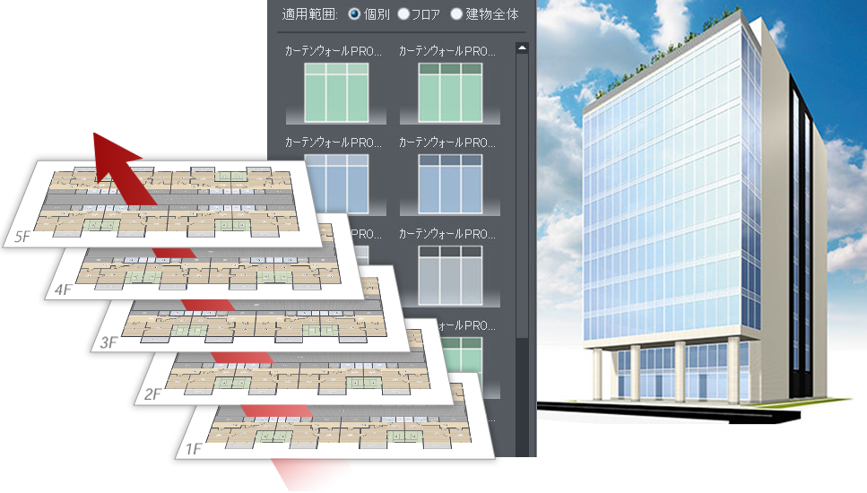地下2階~15階まで作成可能。ビルの外壁を覆うカーテンウォールもワンタッチで作成できます。