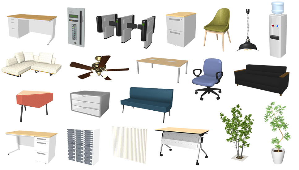 オフィス家具や什器をはじめOA機器・オフィスアクセサリーなどの有名メーカーを含むパーツやテクスチャなど、55,000点以上のデータ素材を収録。