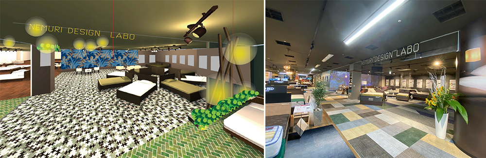 【商業施設のプランニング例・3Dマイホームデザイナーで描いたイメージパース(左)と完成写真(右)】