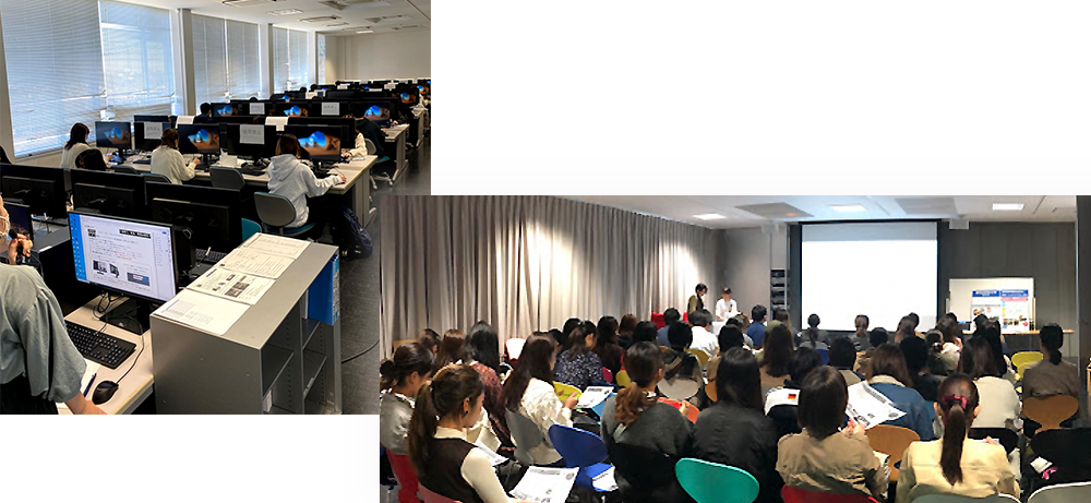 【愛知淑徳大学・松本先生の授業の様子。パソコン室(左)とプレゼン大会の様子(右)】