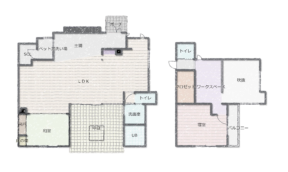 ▲【ワインと映画と愛犬のいる大人空間】デザイナーの初案ラフ図面(JW-CADで作図)