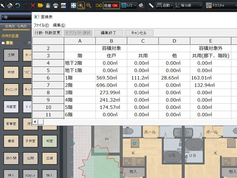 また法定床面積から延床面積には算入されない容積対象外面積や、それを除いた、容積対象床面積も自動計算されます。