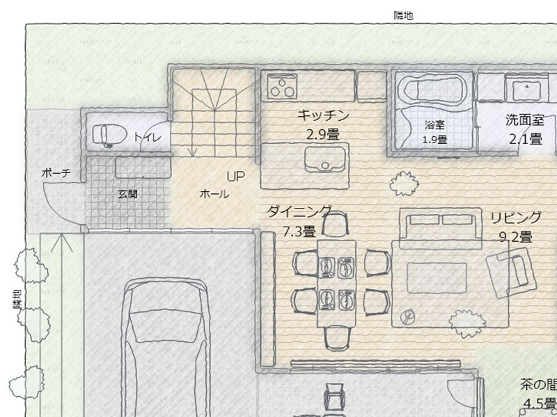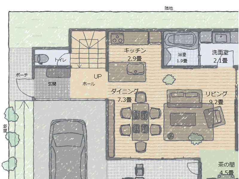 平面図を手描き風に変換 既存のカラー・モノクロ・線画・テクスチャだけでなく、手描き風の平面図もボタン1つで切り替えできるようになりました。 イラストタッチな平面図は、柔らかく、味わいのある雰囲気になるので、プレゼンボードやWebページで使用する際に便利です。 手描き(色鉛筆) 手描き(クレヨン) 選択するだけで変換できる レタッチソフトを使用せずに3Dアーキデザイナーだけで、さまざまなテイストへ素早く切り替えることができます。 変換方法は簡単。お好みのテイストをメニューから選択するだけです。 好みの間取りテイストを選ぶだけ 前のページに戻る PageTop