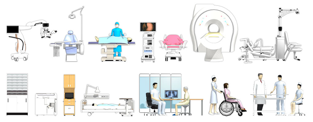 医療機器メーカーの最新医療機器・設備データなど含む高品質素材を収録。医療機器以外にも、診察室や受付用など幅広い種類のデータ素材も揃っています。