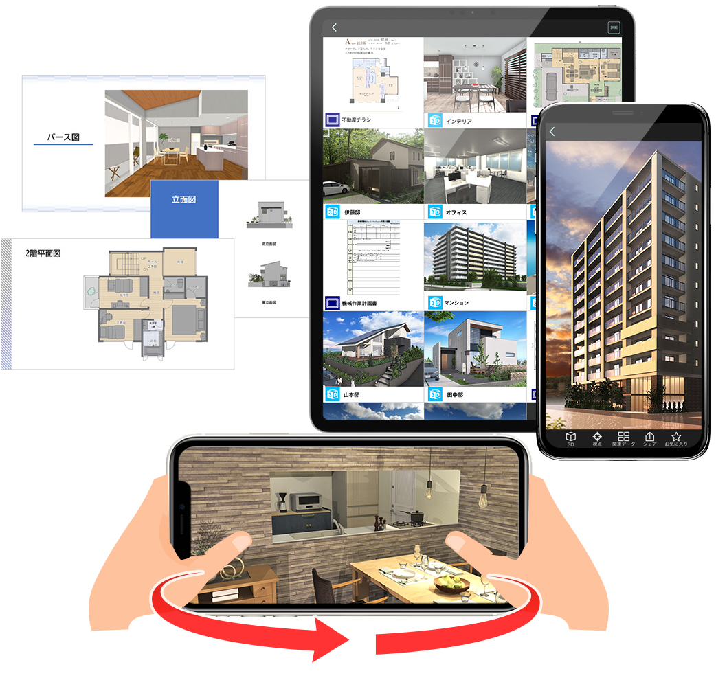さらに建築情報共有サービス「イエクラウド」なら、作成したデータをサーバーにアップして、スマートフォンやタブレットで確認。施主様とプランを共有することが可能です。
