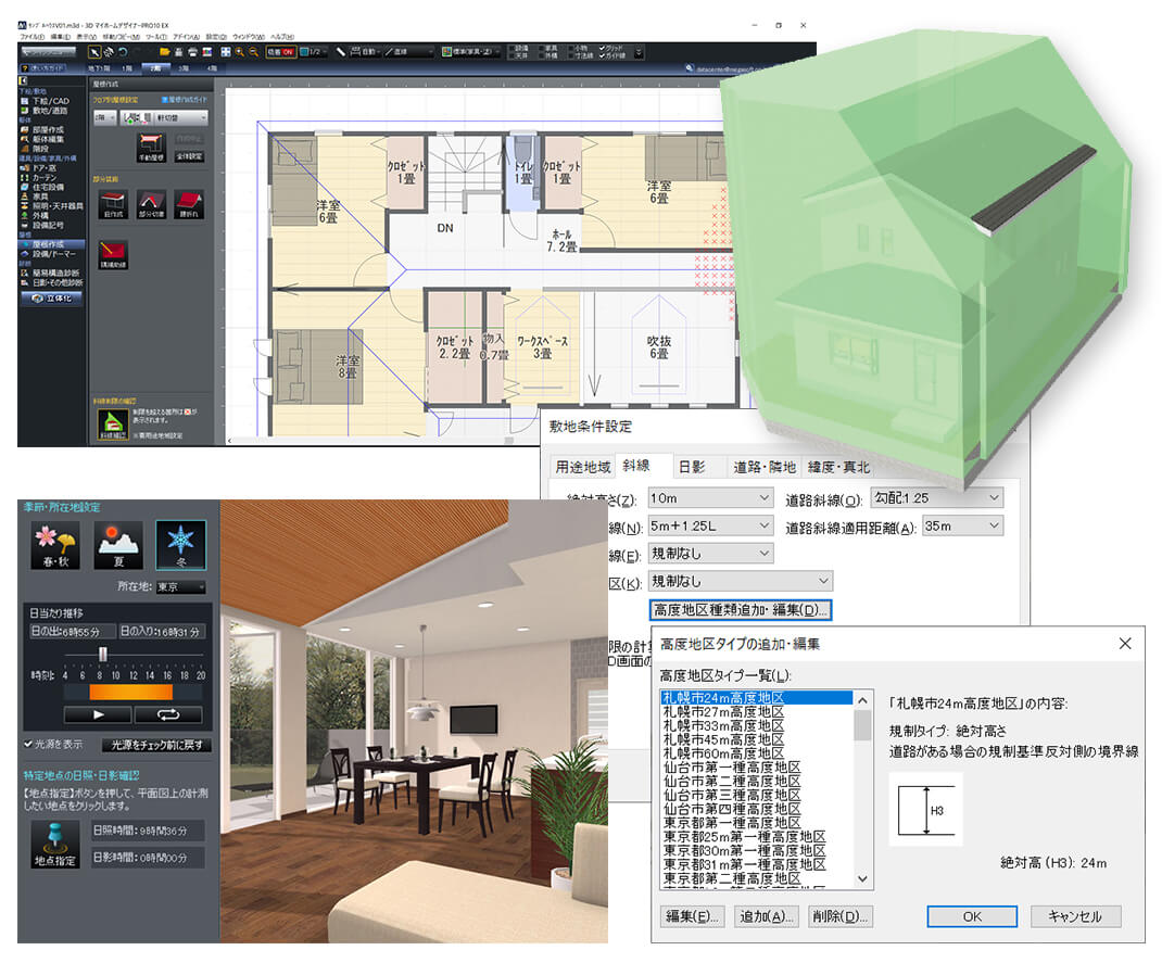 斜線制限チェック、日当たりチェック、発電・消費電力量シミュレーション、時刻日影図・等時間日影図の作成などのさまざまなチェック機能を搭載。