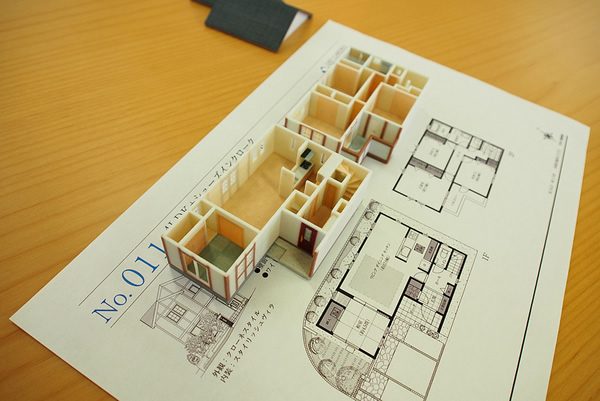 山本さんは模型をひょいと持ち上げて、間取り資料の上に並べます。