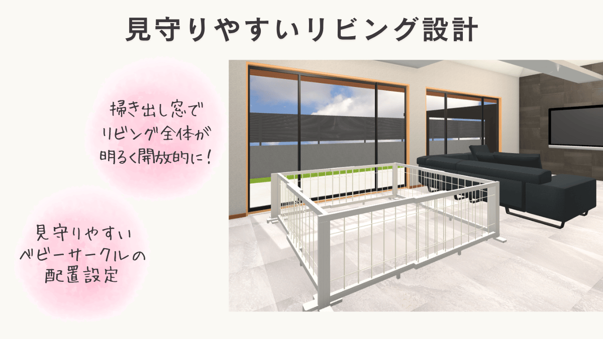 ベビーサークルのサイズや設置位置を、事前に3Dでシミュレーションされたことで安心感のある空間が実現。