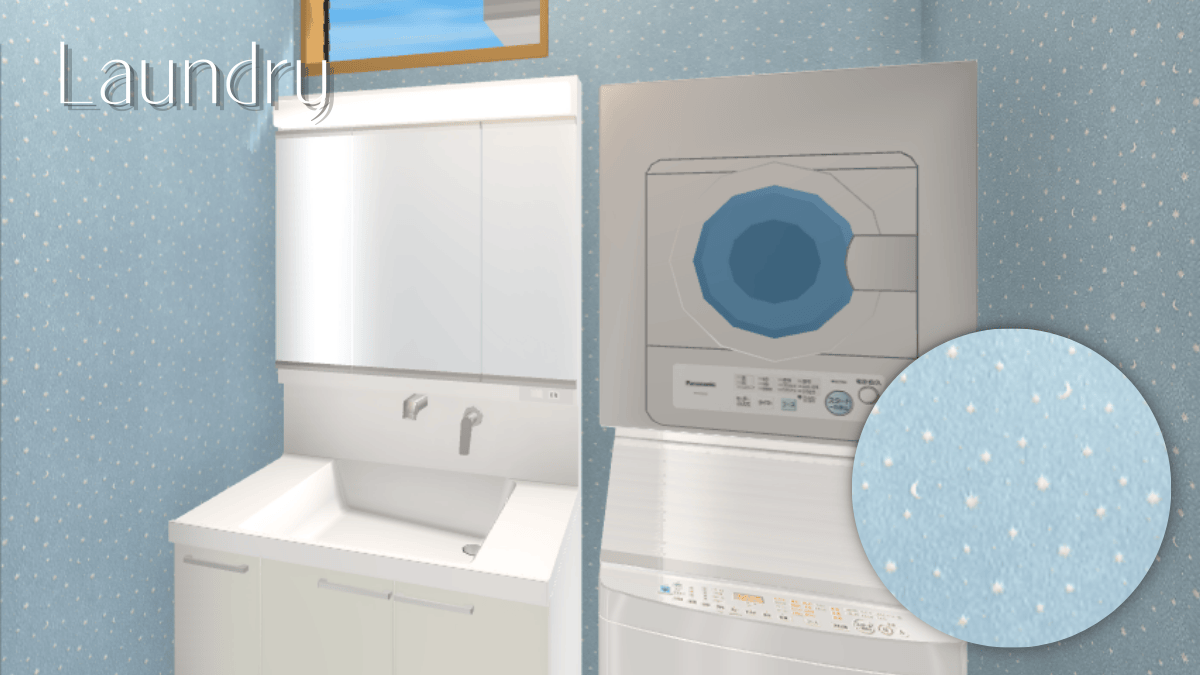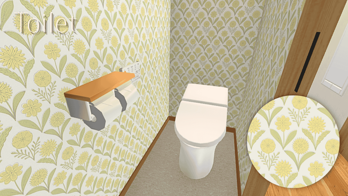 このお家で注目したいのは、寝室、ファミリークローク、洗面所、玄関、トイレと、空間ごとに壁紙を変えているところ!