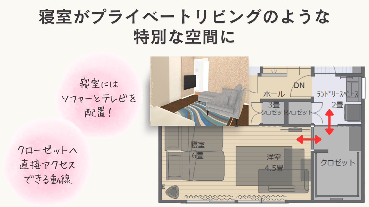 寝室にはソファーとテレビを置き、まるでプライベートリビングのような特別な空間に。