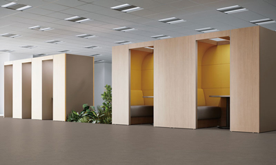 吸音パネルと新素材の「調音材内蔵パネル」で耳にも心地よい、セミオープンなブース空間を提供します。