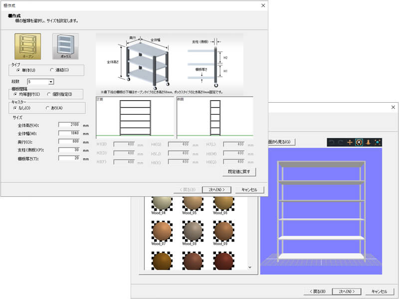 高さや幅、段数や色などを入力するだけでオリジナルの棚が作成できます。