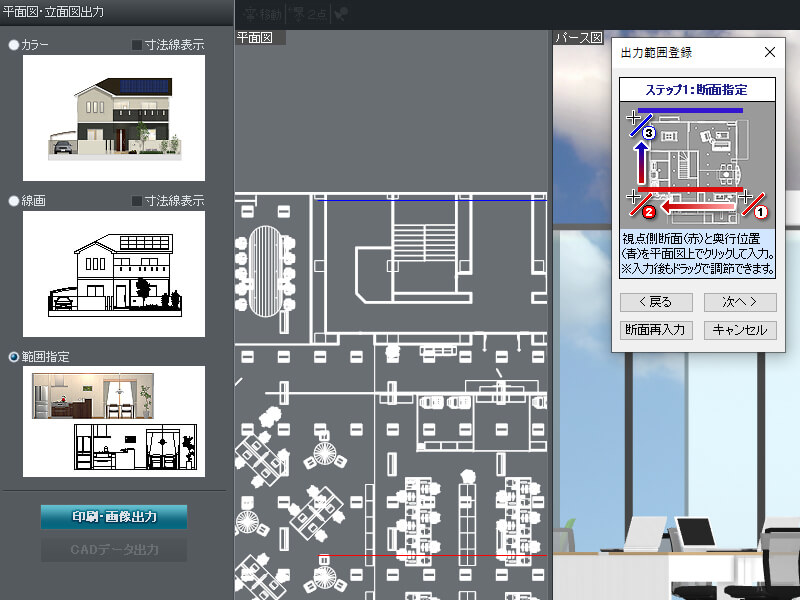 立面図の印刷したい範囲を図面で選択し、範囲指定印刷することができます。 断面部分を図面でスライドさせるだけで自由に変更できます。