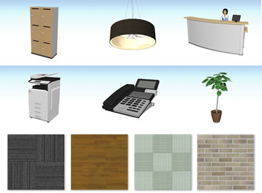 リフォーム時に使用できるシステム天井パーツや、受付、リフレッシュスペースなどに使えるアイテムを追加。最新のオフィス機器、テクスチャを充実しました。